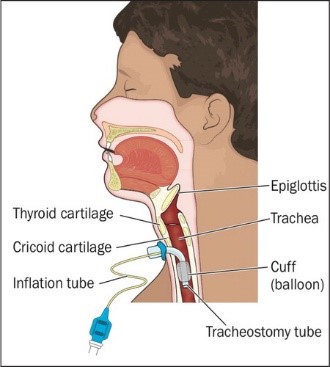 Tracheostomy: A surgical opening made through the neck and into the trachea (windpipe). A breathing tube is inserted into the trachea to open the airway and aid with breathing. The tracheostomy tube and equipment must be cleaned and maintained regularly to reduce the risk of a blockage in the tube from secretions, maximize gas exchange, and minimize the work of breathing.