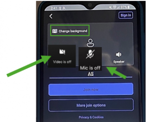 Once in the meeting, tap the camera icon to start video and the microphone icon to mute/unmute. Keep your mic muted unless speaking.