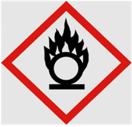 Products that have this label are oxidizers, and are a significant fire hazard if not handled properly. Oxidizers give off oxygen, or other oxidizing substances, and therefore greatly increase the risk of fire or explosion. Oxidizing substances can create a more intense fire, cause substances that wouldn’t normally burn to burn rapidly, or cause some combustible materials to burn spontaneously without the presence of a flame.