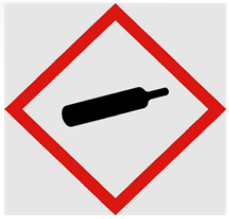 Products with this label contain gases that are stored under pressure in cylinders. These products may carry other health hazards, such as being toxic, flammable, corrosive, etc. Compressed gas containers, if punctured, can become unpredictable and dangerous – often rocketing around the room. Frostbite is also a concern with gases under pressure, as the container can become very cold as the gases escape. The cylinder or container may explode if heated. Refrigerated liquefied gasses are very cold, and can cause severe cold burns.